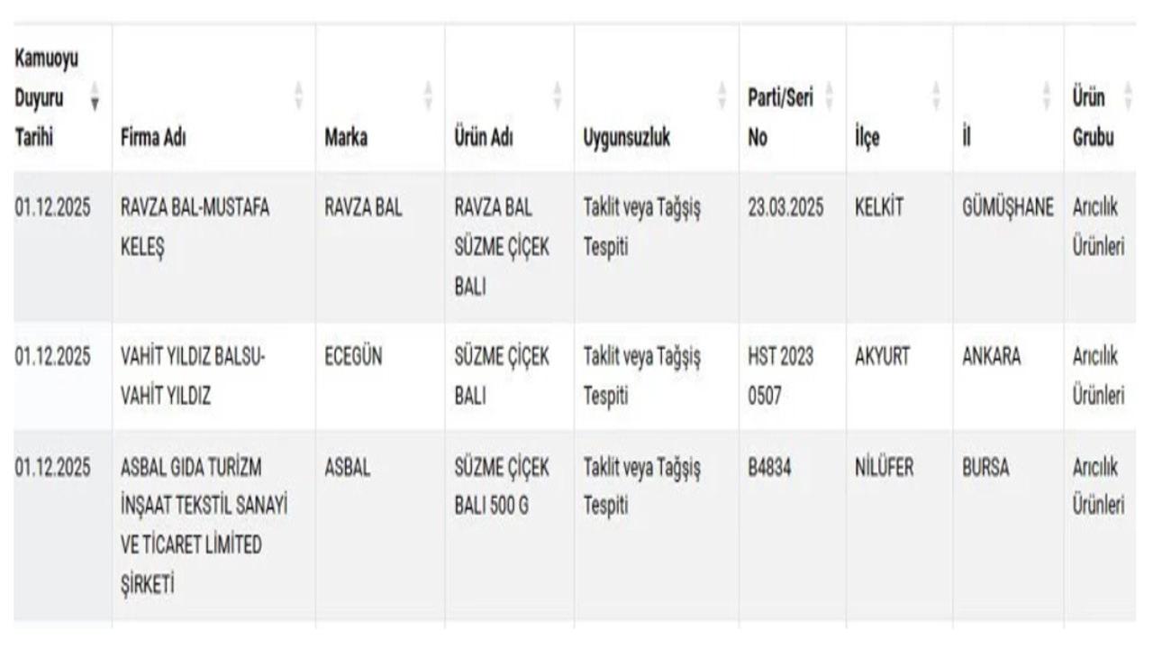 Tarım ve Orman Bakanlığı, 1 Aralık itibarıyla hileli gıda ürünleri listesinde yeni bir güncelleme yaparak kapsamı genişletti. Yapılan denetimlerde üç ayrı markaya ait süzme çiçek balı ürünlerinde taklit ve tağşiş uygulamalarına rastlandı.
