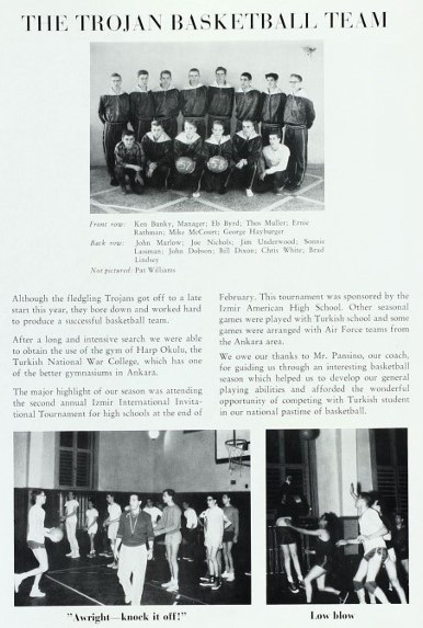 Amerikan Okulu’nun henüz kurulduğu 1957-1958 yılında okul yönetimi öncelikli olarak spor salonu arayışına girdi. Ancak Ankara’da o tarihlerde sadece Kara Harp Okulu’nun kapalı spor salonu var. Türk makamlarının da devreye girmesiyle Amerikan Okulu’na basketbol ve voleybol maçları için Kara Harp Okulu’nun kapalı spor salonu tahsis ediliyor. Amerikan Okulu’na yakın konumdaki Kara Harp Okulu Spor Salonu’nda “Trojans” olarak adlandırılan Amerikan Okulu’nun basketbol takımı “ponpon” kızlar desteğinde hem antrenman yapıyor hem de ikili müsabakalar gerçekleştiriyor.