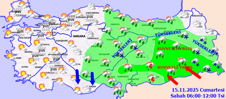 Parçalı ve çok bulutlu, yağmur ve karla karışık yağmurlu, yüksekleri kar yağışlı. Yağışların güneyinde kuvvetli olması bekleniyor.