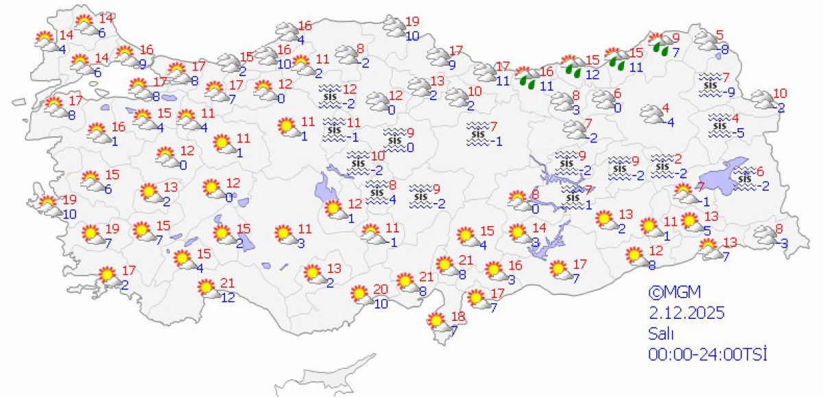 Salı günü ise iç ve doğu bölgelerde yoğun sis görülecek.